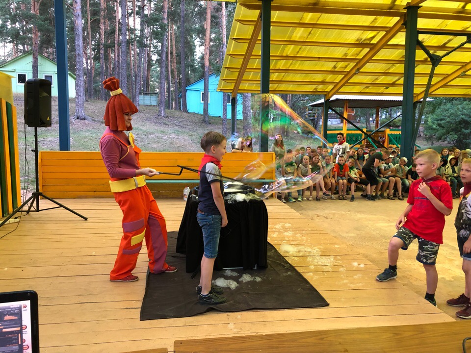 После сна и полдника все собрались на танцплощадке и ждали главного сюрприза. К ним приехали агенство «Самый Лучший День» во главе с Фиксиком и устроили шоу мыльных пузырей. После мыльного шоу каждый отряд показал отличное выступление. Третья смена 85 юбилейного года можно считать официально открытой ! Ура !