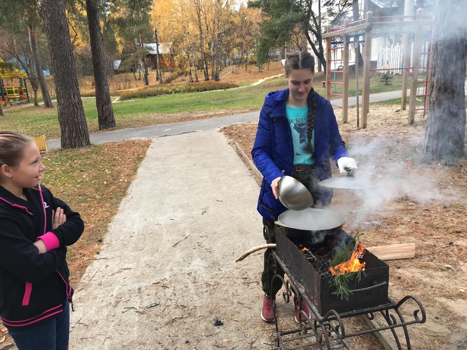 Разместились в большом бревенчатом доме, комнаты девочек-направо, мальчиков-налево, посередине-кухня. Все удобства были внутри. Пока мужская половина воспитанников собирала хворост, женская помогала готовить ужин.